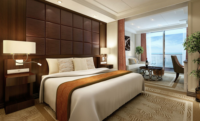 View CabinVeranda Suite H![]() Measures approximately 219 square ftSuites have European king-sized elite slumber bed, marble & stone detailed bathroom, intimate sitting area, built-in closet with safe and private balcony. | Enquire Now |